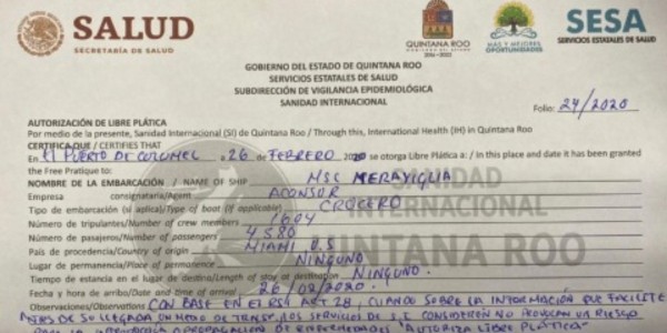 Inicialmente se había dado a conocer que por instrucciones de Sanidad Internacional en Cozumel y a solicitud de la naviera Mediterranean Shipping Company, el crucero MCS Meraviglia canceló su atraque en la terminal de cruceros Punta Langosta, en esta isla, programado para mañana jueves.