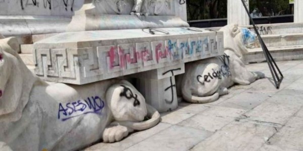 Pese a que el Hemiciclo a Juárez fue resguardado con vallas metálicas, comenzaron a causar daños al monumento, realizando pintas y golpearon las piezas de mármol.