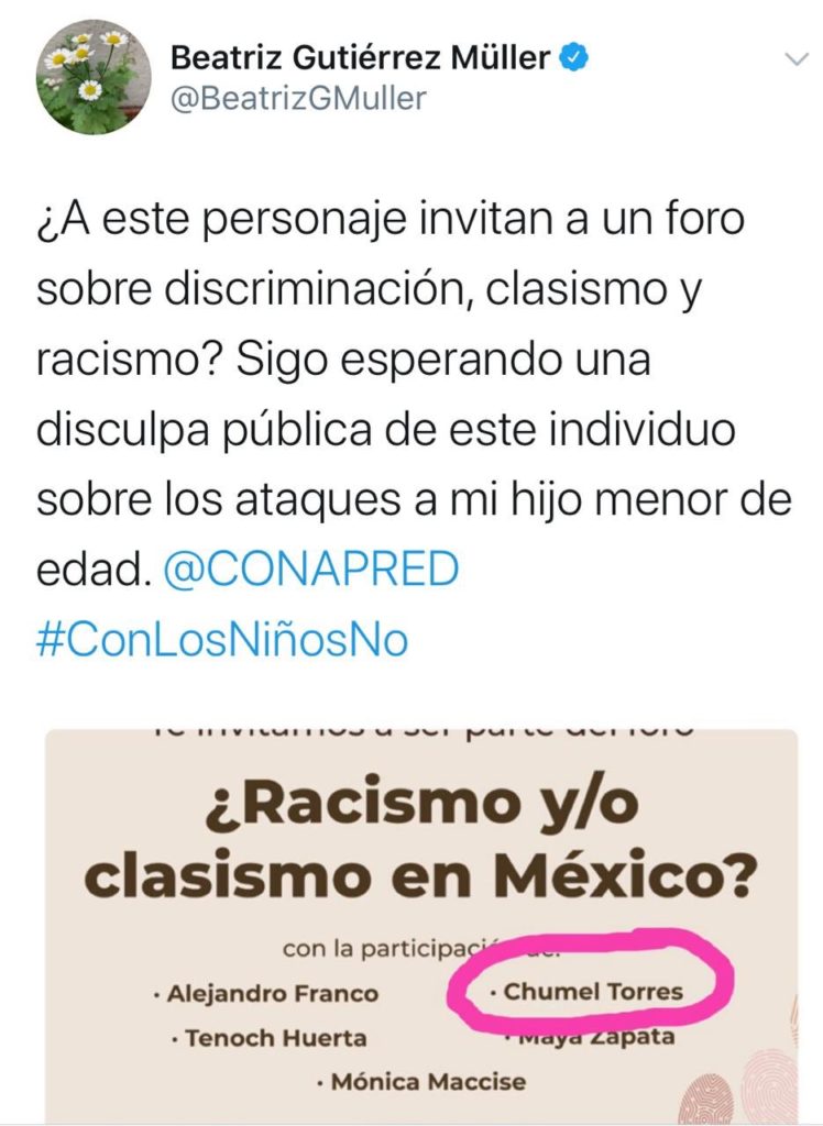Antes de que el foro se cancelara, Beatriz Gutiérrez Müller criticó en sus redes sociales que Chumel Torres fuera uno de los invitados al foro de Conapred y se dirigió a él como “este personaje”.