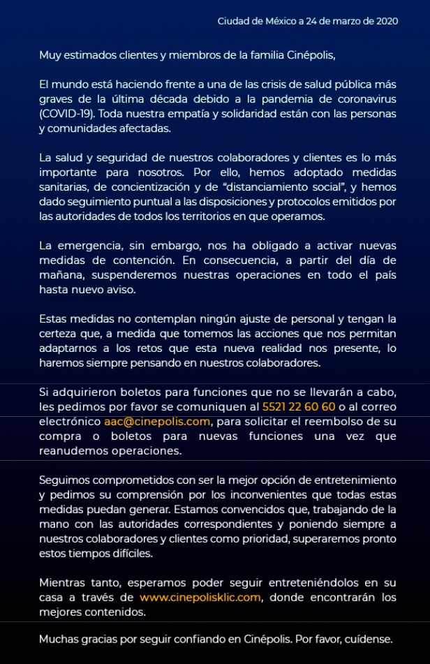 Del mismo modo, informaron que las medidas no contemplan ajustes de personal y s¡e llamó a los clientes que hubieran adquirido boletos para funciones que no se llevarán a cabo a solicitar su reembolso o el cambio por nuevas funciones cuando sea posible.
