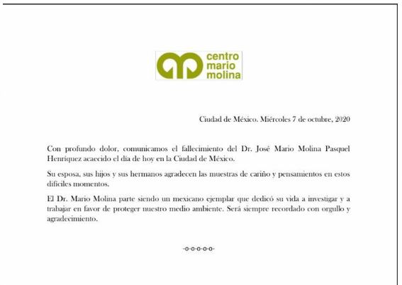 “Con profundo dolor comunicamos el fallecimiento del doctor José Mario Molina Pasquel Henríquez acaecido el día de hoy en la Ciudad de México. Su esposa, sus hijos y sus hermanos, agradecen las muestras de cariño y pensamientos en estos difíciles momentos.“El doctor Mario Molina parte siendo un mexicano ejemplar que dedicó su vida a investigar y a trabajar en favor de proteger nuestro ambiente. Será siempre recordado con orgullo y agradecimiento”, concluye el comunicado.