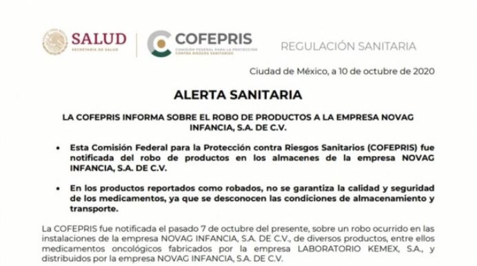 La Cofepris, el principal regulador de alimentos y medicinas de México, informó en un comunicado de que el robo de productos ocurrió el miércoles pasado en los almacenes de la empresa Novag Infancia, donde hurtaron medicamentos oncológicos fabricados por Laboratorios Kemex.