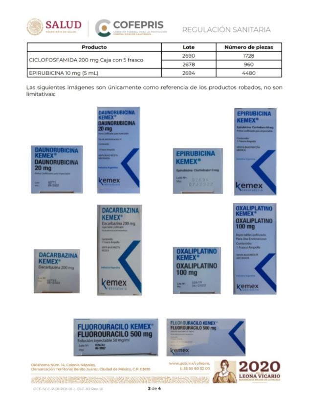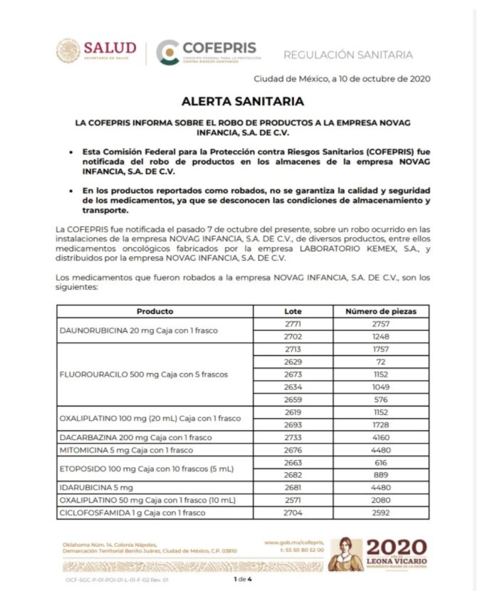 La Comisión Federal para la Protección contra Riesgos Sanitarios (Cofepris) lanzó una alerta sanitaria por el robo de más de 37 mil medicamentos contra el cáncer.