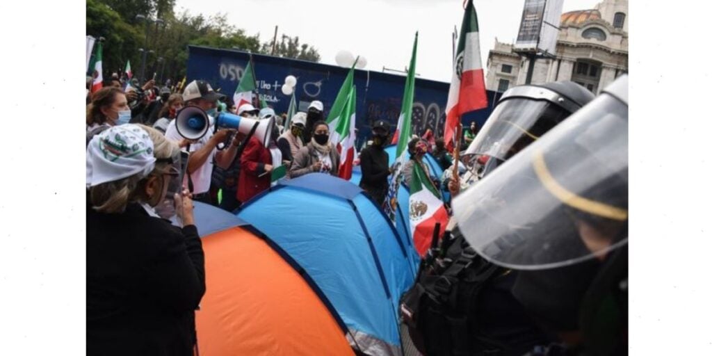 El llamado Frente Nacional AntiAMLO (Frenaa) acudió a manifestación pacífica en la Ciudad de México que pretendía ir del Monumento de la Revolución al Zócalo Capitalino, pero ante un fuerte contingente de policías que les prohibió el paso, optaron por armar su campamento en la Avenida Juárez.