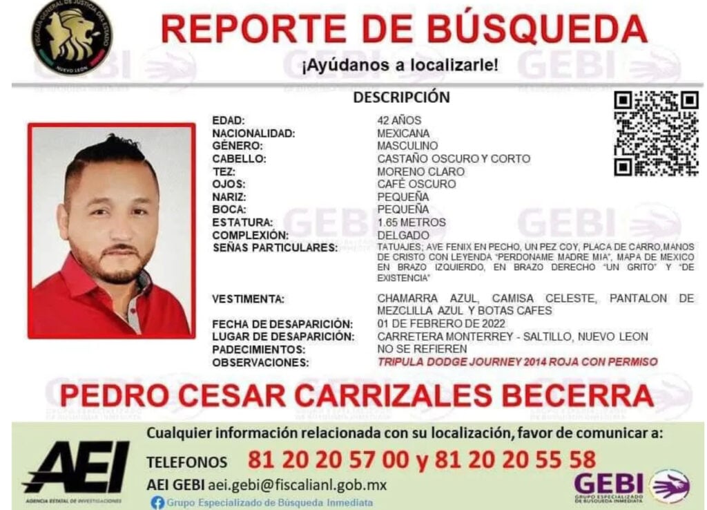 Pedro Carrizales fue visto por última vez en Saltillo, Coahuila, según se informó iría rumbo a Monterrey en su camioneta roja.