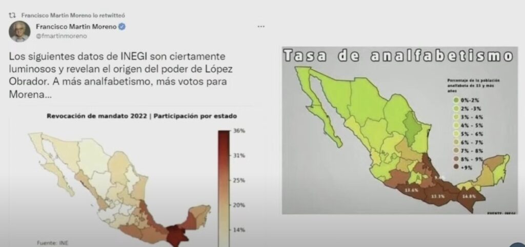 “(Francisco Martín, columnista de Reforma) Una vez puso que en donde hay más analfabetas es donde Morena tiene más presencia. Eso es mucho de la mentalidad conservadora, reaccionaria, retrógrada de estas personas, como si educación fuese lo mismo que cultura”, afirmó AMLO en su conferencia mañanera.