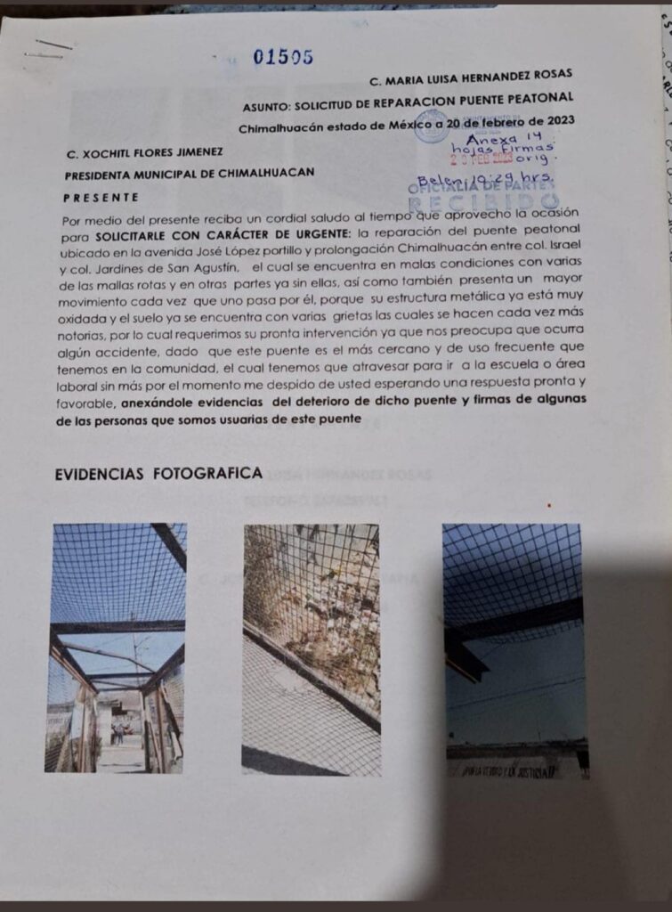 “Requerimos su pronta intervención ya que nos preocupa que ocurra algún accidente, dado que el puente es el más cercano y de uso frecuente que tenemos en las comunidades, el cual tenemos que atravesar para ir a la escuela o área laboral”, dice la misiva enviada a la alcaldesa de Chimalhuacán, Xóchitl Flores Jiménez.