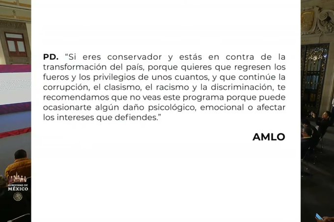 “Si eres conservador y estás en contra de la transformación del país, porque quieres que regresen los fueros y los privilegios de unos cuantos, y que continúe la corrupción, el clasismo, el racismo y la discriminación, te recomendamos que no veas este programa, porque puede causarte algún daño psicológico, emocional o afectar los intereses que defiendes”, se escuchó en el audio.