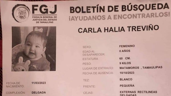 Tamaulipas – La desaparición Carla Halía Treviño, una bebé de 6 meses de edad, ha sacudido a todo Tamaulipas, en especial porque se denunció su desaparición poco después de que su mamá intentó quemarla viva.