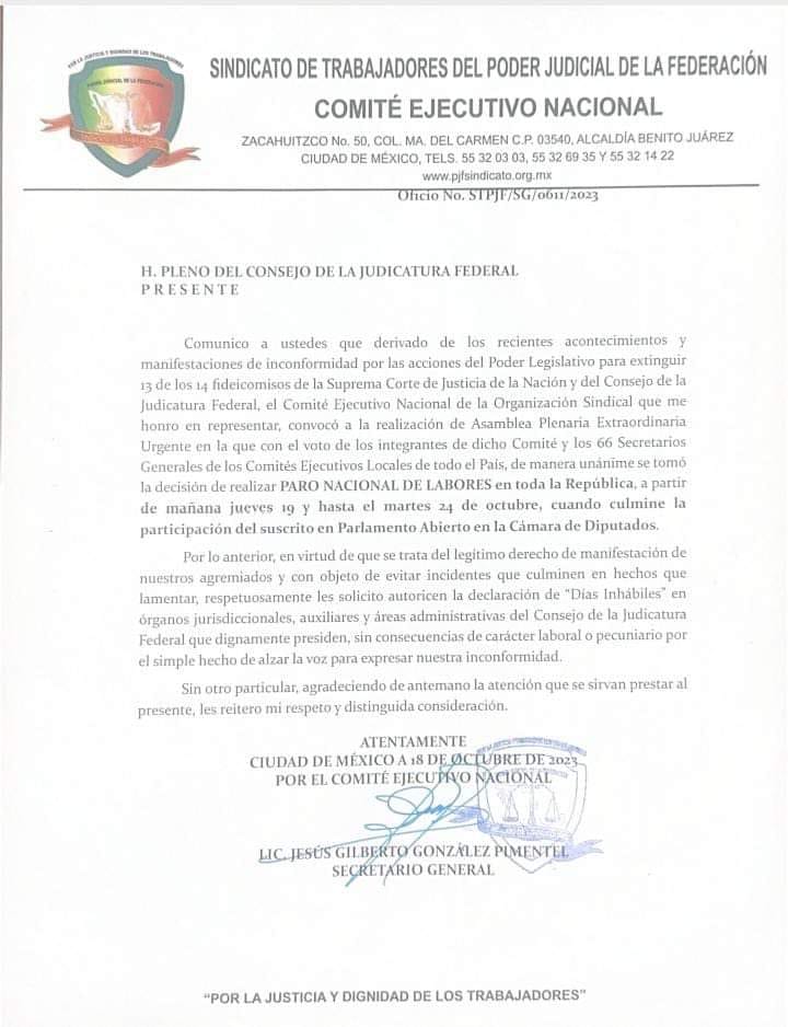 Sindicato de Trabajadores del Poder Judicial de la Federación confirmó este jueves 19 de octubre que todas las secciones irán a paro, por lo menos hasta el martes 24 de octubre, como medida de protesta contra la extinción de 13 de 14 fideicomisos que financian sus labores.