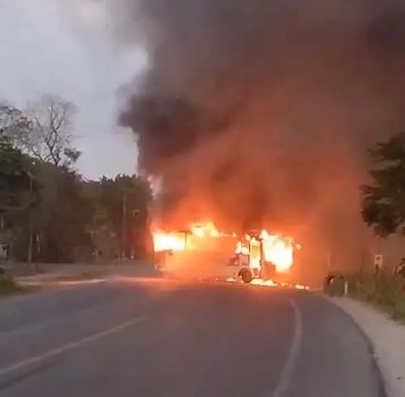 Tras las detenciones, delincuentes prendieron fuego al menos a ocho vehículos en las vialidades mencionadas, entre ellos un camión de pasajeros y dos taxis.