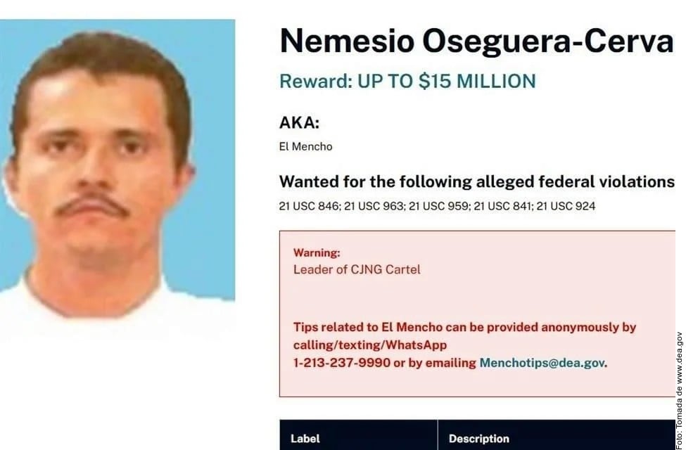 Desde 2018, el Departamento de Estado ofrecía 10 millones de dólares por información para el arresto de "El Mencho", pero con el aumento de hoy a 15 millones la recompensa se hace comparable a la ofrecida en su momento por Ismael "El Mayo" Zambada, fundador del Cártel de Sinaloa arrestado en agosto.