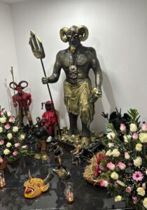 Satanás con efigies de distintos tamaños, entre ellos, una de tonalidades doradas, de más de un metro y medio de altura, parado sobre dinero y con un tridente en la mano.