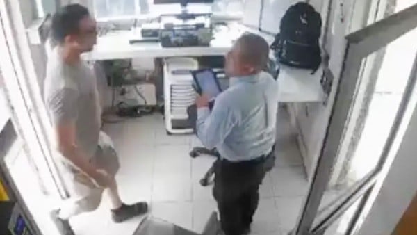 Tras la agresión, el segundo guardia ingresa a la caseta para tomar otra tableta y, presumiblemente, realizar la denuncia del hecho.