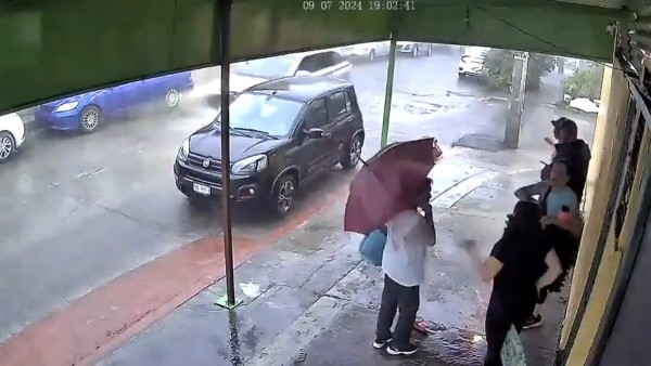 Las imágenes muestran a las tres mujeres y los dos hombres platicando mientras pasa la lluvia, cuando de pronto aparece una camioneta color gris desde la cual los sicarios disparan, aparentemente contra los dos hombres.