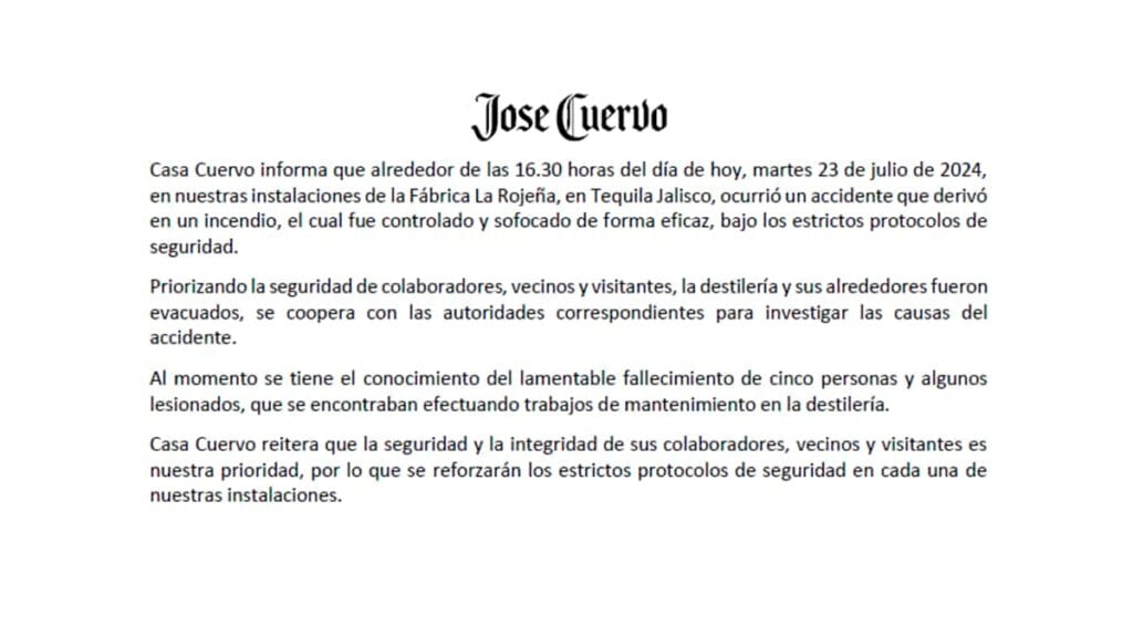 Por la noche Casa Cuervo lanzó un comunicado en el que da a conocer los pormenores del accidente registrado este martes.