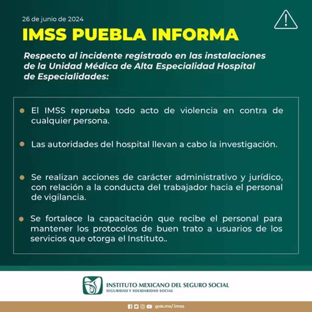 Luego de que se viralizara el video, el IMSS Puebla emitió un comunicado en el que confirma que llevarán a cabo una investigación para determinar responsabilidades y sancionar de manera correspondiente.