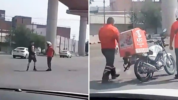 Tras varios segundos así, parece que el pleito no pasará a mayores, pero entonces aparece un segundo repartidor de KFC que aparece para ayudar a su compañero, lo que reanuda las tensiones.