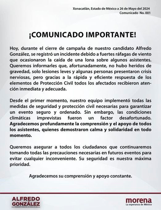 El de campaña de Alfredo González emitió un comunicado dirigido a la prensa y a la sociedad en general. "No hubo heridos de gravedad, solo lesiones leves y algunas personas presentaron crisis nerviosas, pero gracias a la rápida y eficiente respuesta de los elementos de Protección Civil, todos los afectados recibieron atención médica inmediata y adecuada", se lee en el comunicado.