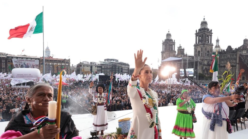 Ciudad de México - La presidenta Claudia Sheinbaum salió al Zócalo donde le entregarán el Bastón de Mando.