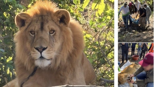 El león estaba amarrado a un árbol con una cadena, lo que le provocó severas laceraciones en la zona del cuello.