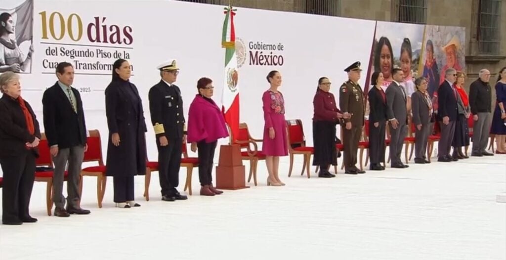 Ciudad de México - La presidenta Claudia Sheinbaum encabeza este domingo el Informe de los primeros 100 días de su administración desde un templete en compañía de su Gabinete en el Zócalo capitalino.