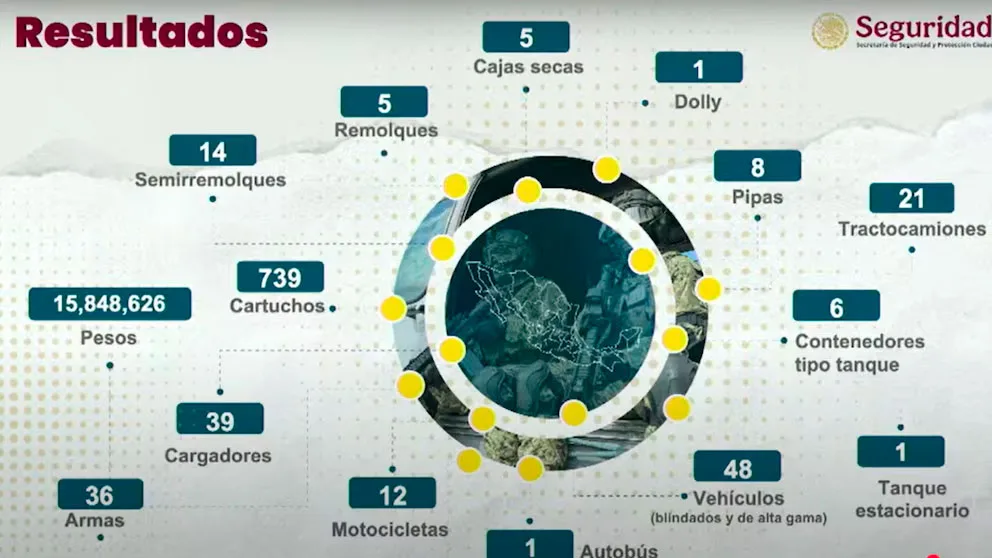 Entre los objetos asegurados se encuentran, cinco cajas secas, cinco remolques, 14 semiremolques, un dolly, ocho pipas, 21 tractocamiones, seis contenedores tipo tanque, un tanque estacionario, 48 vehículos, un autobús, 12 motocicletas. Durante el operativo también se consumó el aseguramiento de 36 armas, 39 cargadores, 739 cartuchos y 15 millones 848 mil 626 pesos.