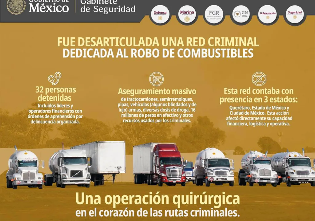 Ciudad de México— La Secretaría de Seguridad y Protección Ciudadana (SSPC) informó el desmantelamiento de una red criminal dedicada al robo y comercialización ilícita de hidrocarburo (huachicol).