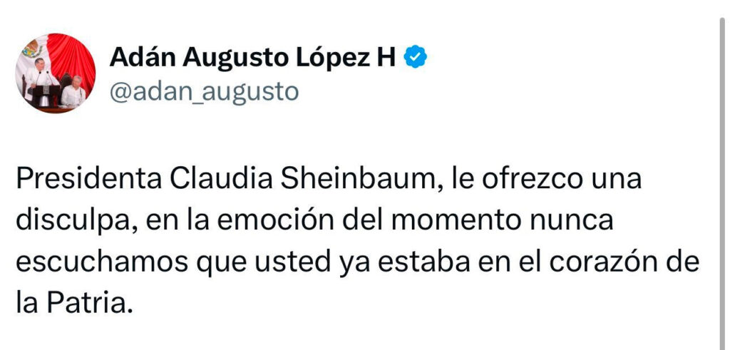 "Presidenta Claudia Sheinbaum, le ofrezco una disculpa, en la emoción del momento nunca escuchamos que usted ya estaba en el corazón de la Patria", escribió.