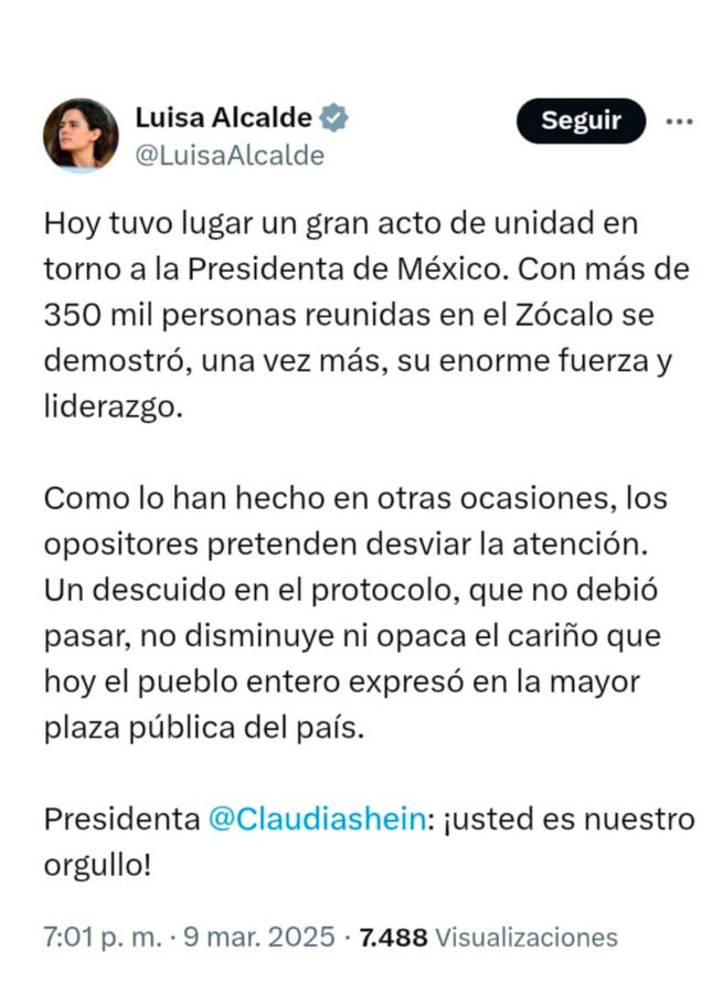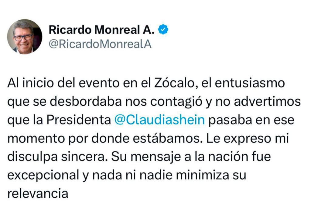 "Al inicio del evento en el Zócalo, el entusiasmo que se desbordaba nos contagió y no advertimos que la Presidenta @claudiashein pasaba en ese momento por donde estábamos. Le expreso mi disculpa sincera. Su mensaje a la nación fue excepcional y nada ni nadie minimiza su relevancia", decía el mensaje que eliminó minutos después.