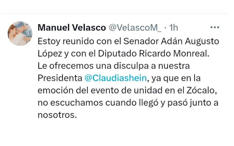 "Estoy reunido con el Senador Adán Augusto López y con el Diputado Ricardo Monreal. Le ofrecemos una disculpa a nuestra Presidenta, ya que en la emoción del evento de unidad en el Zócalo, no escuchamos cuando llegó y pasó junto a nosotros", manifestó.
