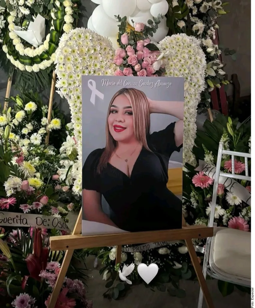 María del Carmen Sánchez, de apenas 21 años, fue despedida con mariachi y flores. Su féretro fue cargado en hombros por sus seres queridos, mientras, frente a éste fue colocado un cuadro que la mostraba ya con alas, sobre una nube, vestida de rosa.