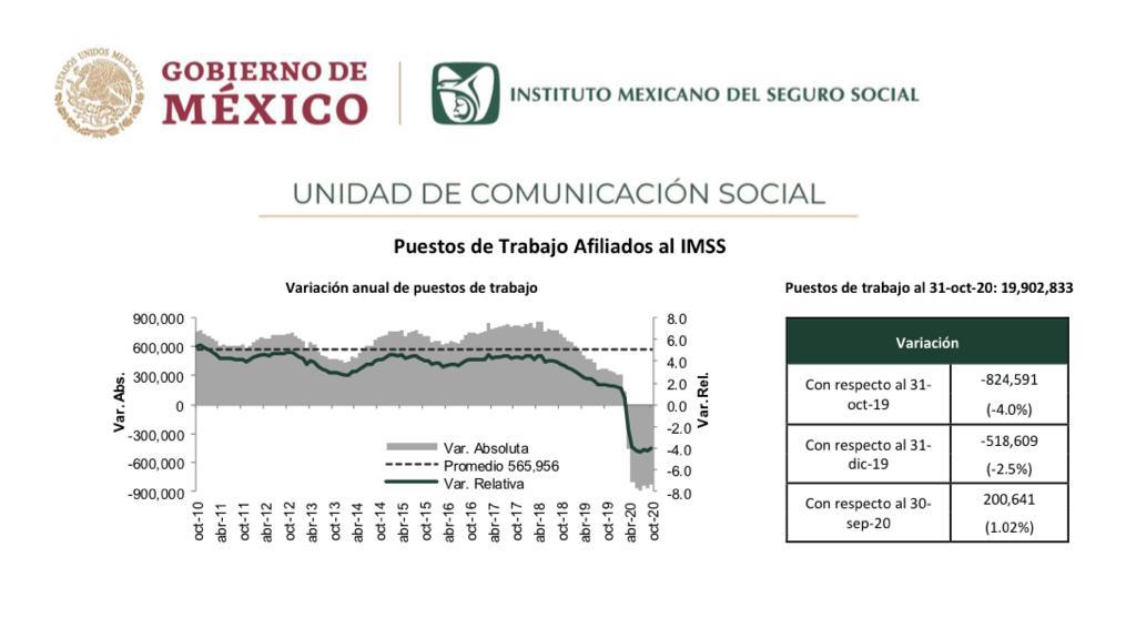 Y aunque en octubre se mantuvo el crecimiento en el número de empleos registrados en el IMSS respecto al mes anterior, este apenas fue del 1%, con 200 mil 641 nuevos puestos laborales generados.