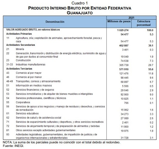 “El sector terciario también ha sido clave para el desarrollo económico de la entidad”, precisó.En 2021, la economía de Guanajuato presentó un PIB nominal de más de mil 29 millones de pesos.Las actividades primarias participaron en el producto total de la entidad con el 5.3 %, las secundarias con el 39.1 % y las terciarias 55.6 por ciento.MEJZ*