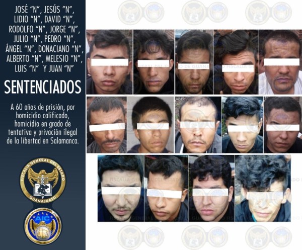 La Fiscalía General del Estado (FGE) obtuvo 60 años de prisión, máxima condena establecida en Guanajuato, para 14 integrantes de una célula delictiva desarticulada en Salamanca, los cuales mantuvieron a dos hombres privados de su libertad y mataron a golpes a uno de ellos.