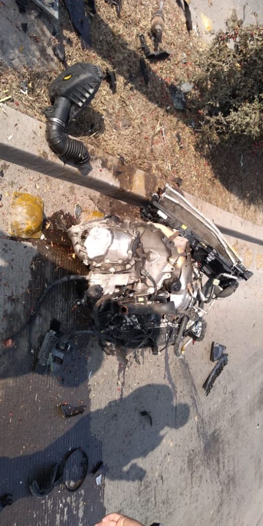 Al lugar acudieron agentes de vialidad, mismos que localizaron un vehículo Chevrolet Sonic color guinda con un impacto frontal y su motor a unos cuantos metros del mismo.