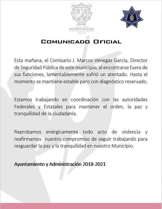 De acuerdo al comunicado publicado por el Municipio de Dolores Hidalgo, el comisario se encontraba en su día de descanso cuando fue atacado.