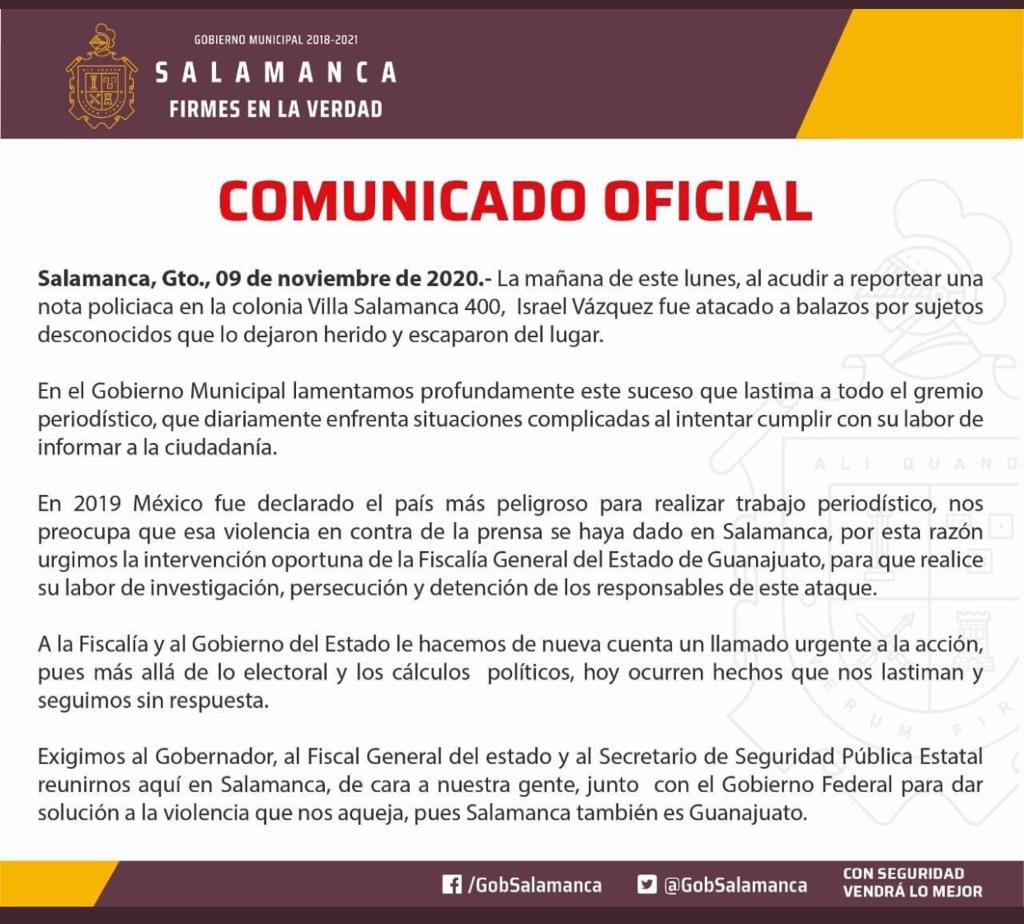 En un comunicado, el Municipio de Salamanca confirmó que el reportero fue atacado por hombres que lograron huir del lugar.