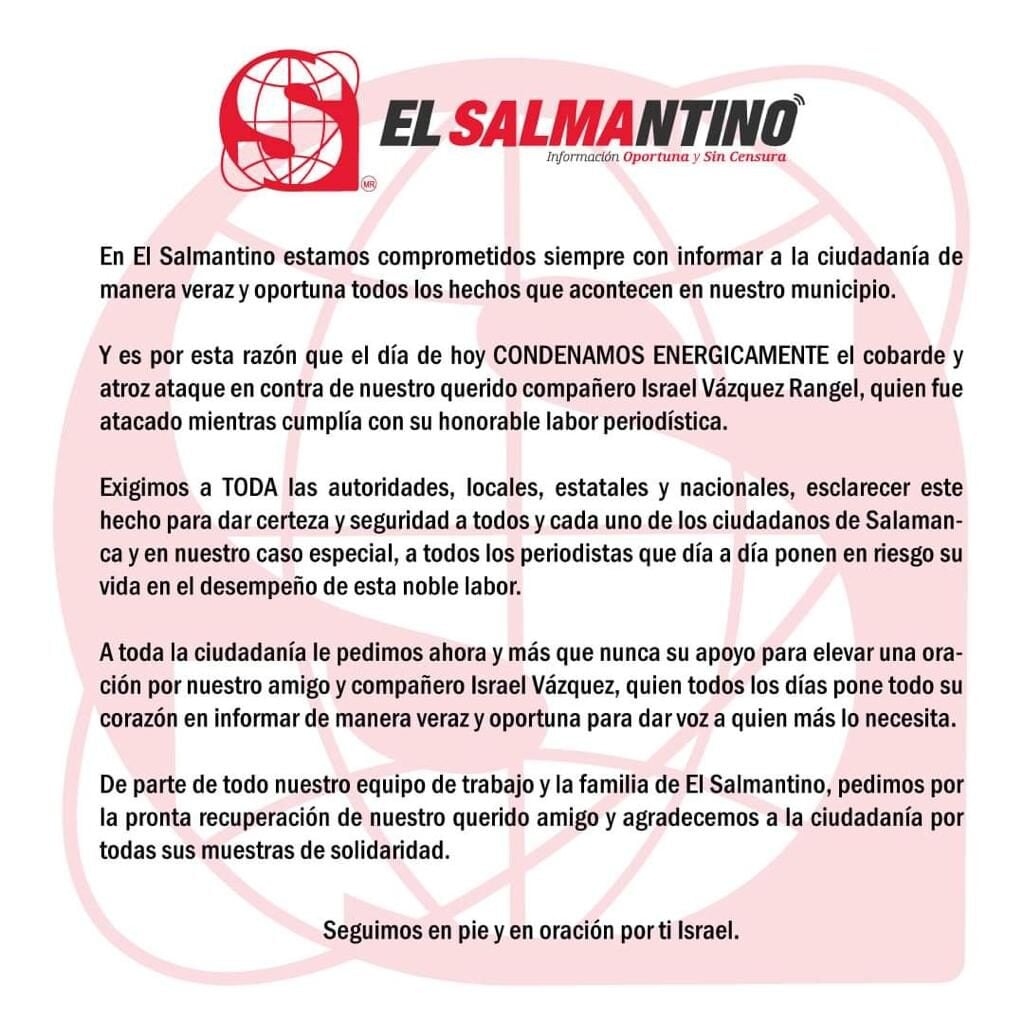 En sus redes sociales, el medio El Salmantino condenó la agresión de su reportero y pidió oraciones por su pronta recuperación, pues se informó que su estado es grave.