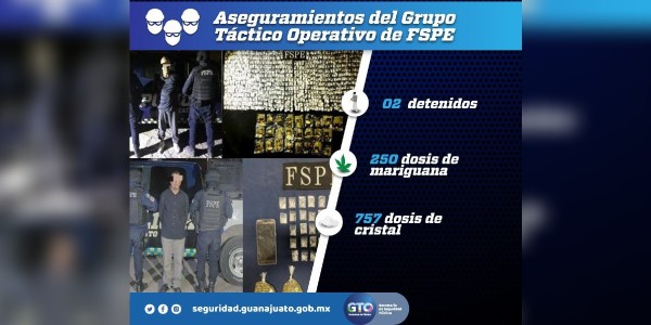 Dos hombres fueron capturados con más de mil dosis de mariguana y cristal gracias a los patrullajes del Grupo Táctico Operativo (GTO) de las Fuerzas de Seguridad Pública del Estado (FSPE).