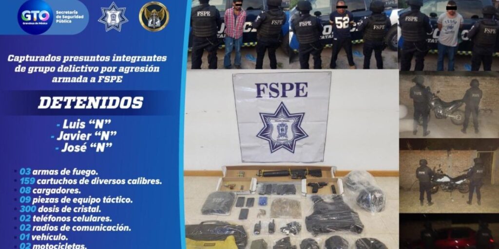 Elementos del Grupo Táctico Operativo (GTO) de las FSPE lograron la captura de tres presuntos integrantes de un grupo delictivo después de que los efectivos estatales repelieron una agresión armada en la comunidad Cañada de Caracheo de este municipio.