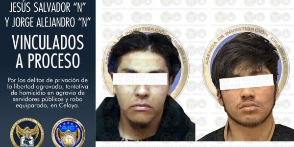 Jesús Salvador de 21 años y Jorge Alejandro de 18 años, fueron enviados a prisión de manera preventiva, mientras se amplía la investigación iniciada en su contra.El día 20 de abril de 2021 los imputados a bordo de un vehículo de motor de la marca Buick, que de manera posterior se confirmó que había sido robado con violencia en otra ciudad, llegaron a las inmediaciones de una clínica privada, acompañados de tres sujetos más portando armas de fuego, y privaron de su libertad a un hombre que estaba siendo atendido, a quien sometieron y abordaron al vehículo para después darse a la fuga.Los agresores fueron interceptados más adelante sobre el eje Juan Pablo II en donde elementos de la Agencia de Investigación Criminal a través de códigos visuales y verbales les marcaron el alto, pero hicieron caso omiso y se dio una persecución a la cual se unieron elementos de seguridad pública municipal, hasta las inmediaciones de las instalaciones de Conagua, en donde ya se encontraban otros agentes de investigación a quienes realizaron detonaciones para evitar ser detenidos.El vehículo Buick se detuvo sobre el acotamiento del bulevar Juan Pablo II en la colonia Portones de la Hacienda, y los tripulantes se resguardaron en tierras de cultivo desde donde enfrentaron a tiros a los agentes.Una vez que se logró controlar la situación, se solicitó el apoyo de unidades de emergencia para brindar atención médica a los involucrados, mientras que tres de los agresores, fueron abatidos en el lugar, en tanto se liberó y trasladó a recibir atención médica al lesionado, quien había sido privado de su libertad poco antes.Jesús Salvador y Jorge Alejandro fueron detenidos en el lugar y puestos a disposición del Ministerio Público, donde se llevaron a cabo las indagatorias e integración de la carpeta de investigación.Al término de ley los detenidos fueron llevados ante la autoridad jurisdiccional a audiencia de control de detención, donde se calificó de legal la misma y posteriormente fueron imputados por el agente del Ministerio Público, quien obtuvo que fueran vinculados a proceso penal con prisión preventiva como medida cautelar.MEJZ*