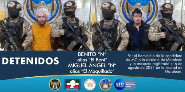 “La @FGEGUANAJUATO a través de la @AIC_Guanajuato y en coordinación con @SeguridadGto, @SEDENAmx, @GN_MEXICO_ han logrado la detención de Benito N y Miguel Ángel N, con ord. de aprehensión por homicidio de la candidata de MC en Moroleón y multihomicidio en un bar de esa ciudad”, informó en Twitter.