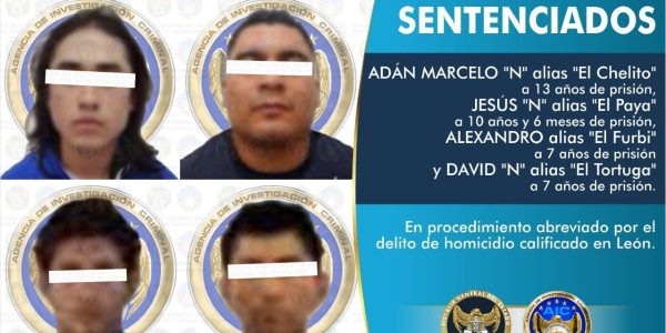 La Fiscalía General del Estado (FGE) obtuvo sentencias condenatorias para Marcelo Adán, alias “El Chelito”; Jesús, alias el "El Paya”; Alexandro, alias “El Furbi” y David, alias “El Tortuga”, todos integrantes de una célula criminal de un grupo delictivo, y que fueron condenados a prisión por el asesinato de un hombre en León.