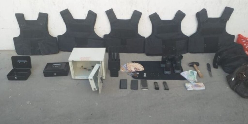 También se aseguraron 5 chalecos balísticos, una caja fuerte y dos cajas negras, equipos de radiocomunicación, un inhibidor de señal GPS, un arma corta, cartuchos y cargadores, así como dinero en efectivo y celulares.