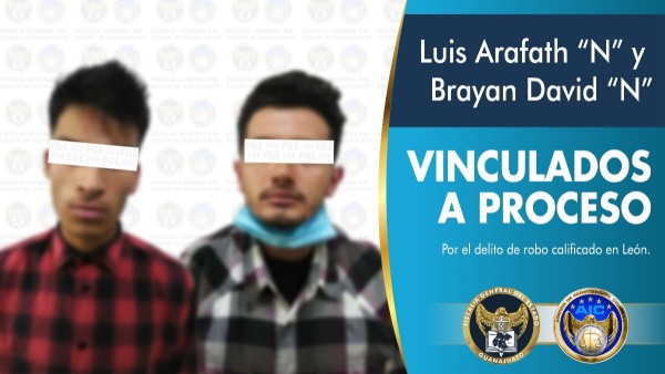 En audiencia judicial un agente especializado del Ministerio Público, obtuvo que un juez dictara auto de vinculación a proceso penal, en contra de Luis Arafath y Brayan David, por su probable responsabilidad en la comisión del delito de robo calificado; estos sujetos robaron con violencia el vehículo a una pareja.