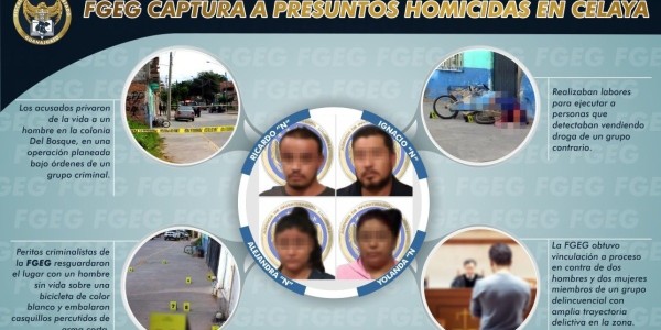Agentes de Investigación Criminal detuvieron a dos hombres y dos mujeres miembros de un grupo delincuencial con amplia trayectoria delictiva en Celaya; los detenidos ejecutaban a las personas que detectaban vendiendo droga de un grupo contrario.