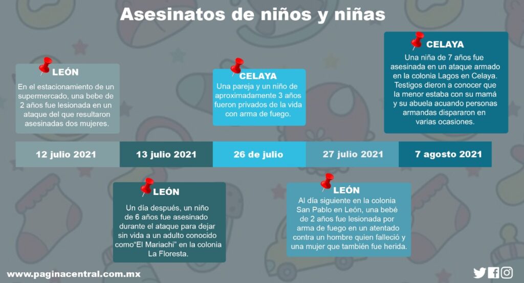 Entre el 12 de julio y el 7 de agosto, al menos cinco niños y niñas menores de ocho años han sido víctimas de ataques armados en ciudades como León y Celaya, donde los indicadores de violencia van al alza.