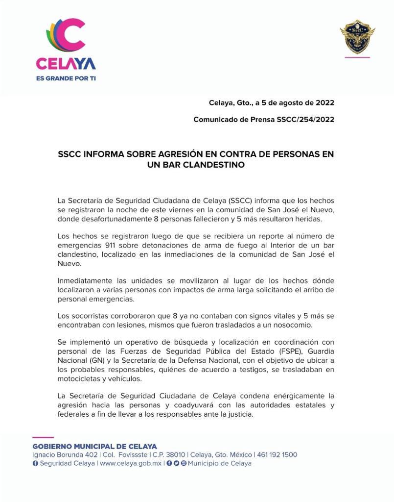 “La Secretaría de Seguridad Ciudadana de Celaya condena enérgicamente la agresión hacia las personas y coadyuvará con las autoridades estatales y federales a fin de llevar a los responsables ante la justicia”, finalizó la dependencia.