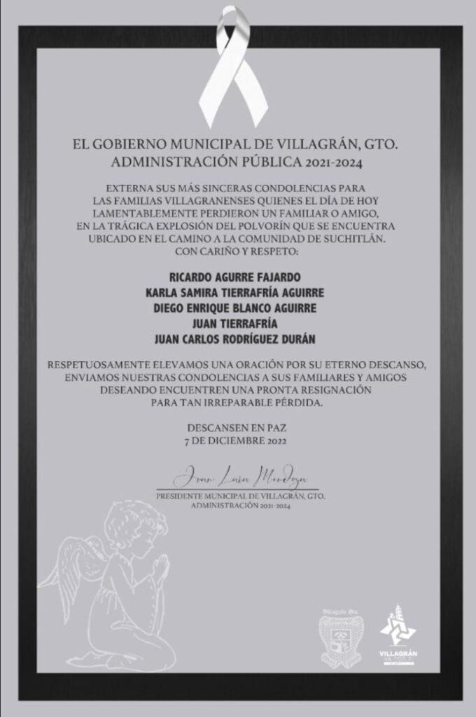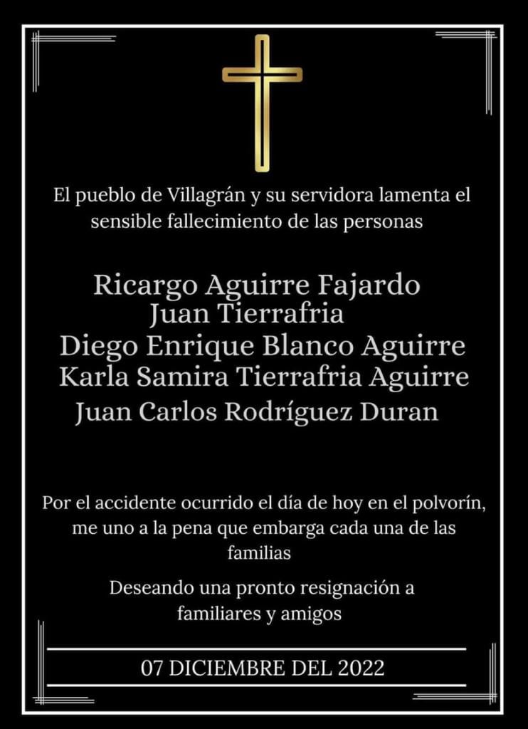 El alcalde de Villagrán, Juan Lara Mendoza, también externó sus condolencias a por el fallecimiento de estas pesonas tras la explosión del polvorín.